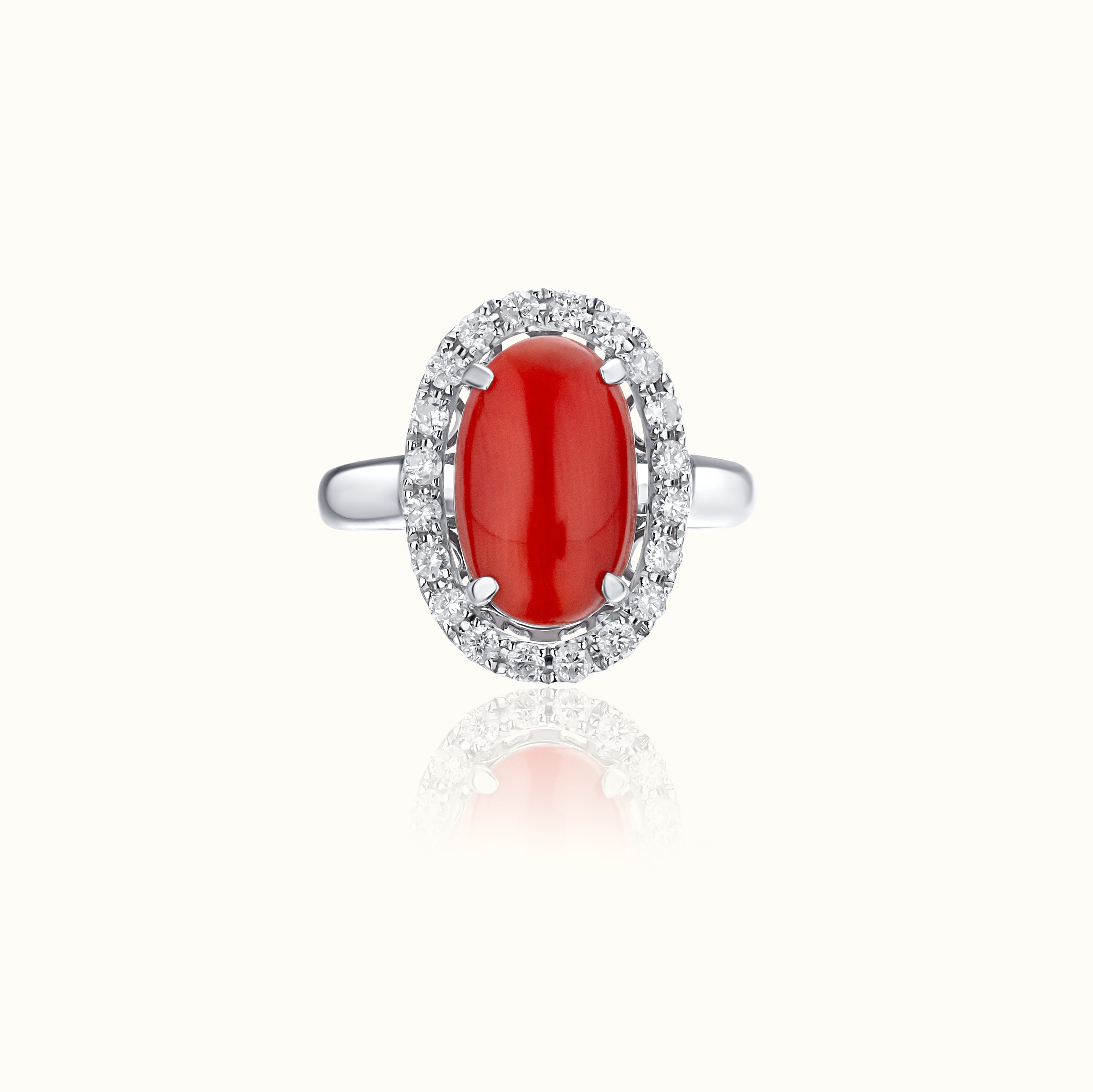 A vibrant fine jewelry set featuring cabochon coral and natural diamonds across matching stud earrings, pendant, and ring. Crafted in polished 14K white gold.