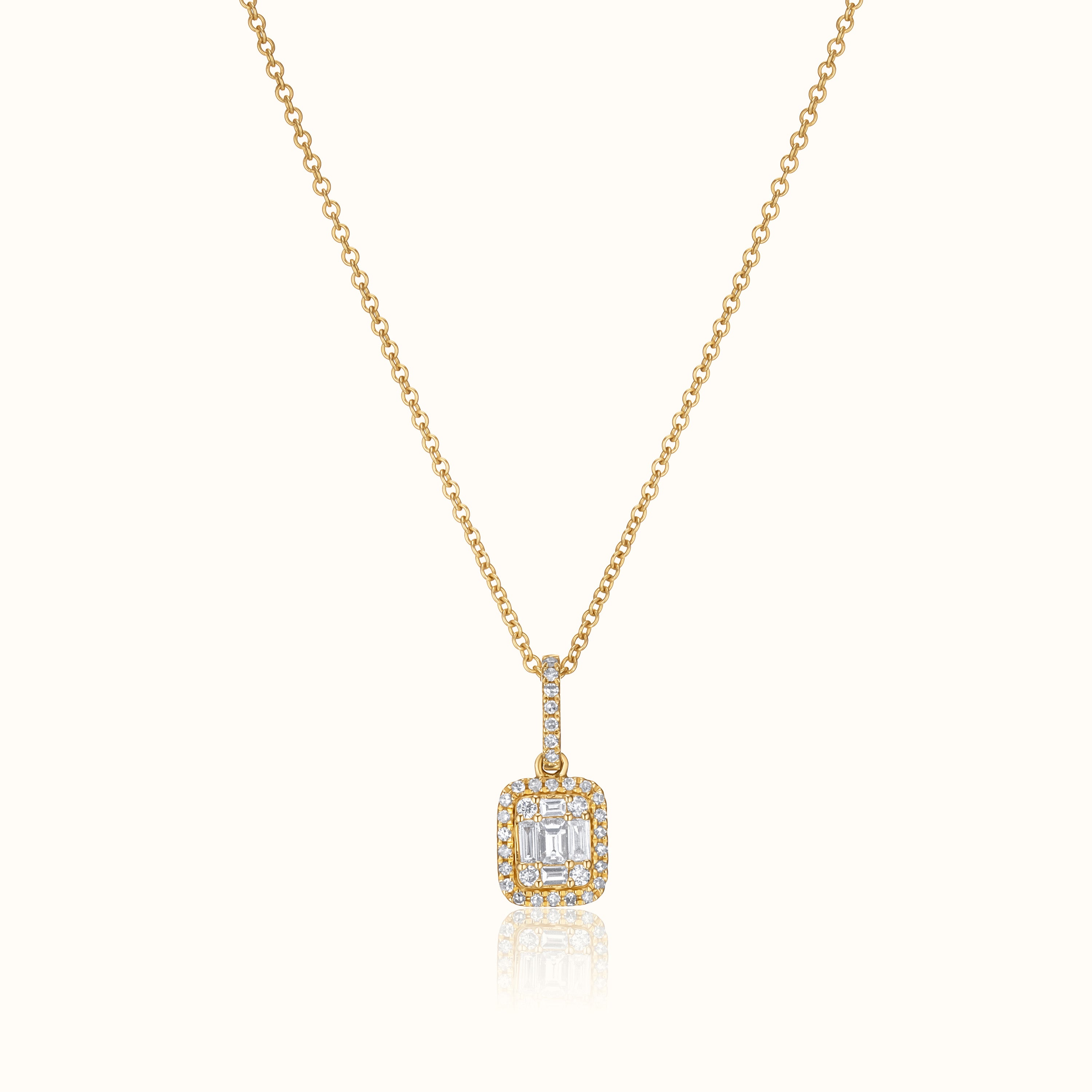 A classic diamond pendant necklace crafted in polished 14K yellow gold and set with natural diamonds for timeless elegance.