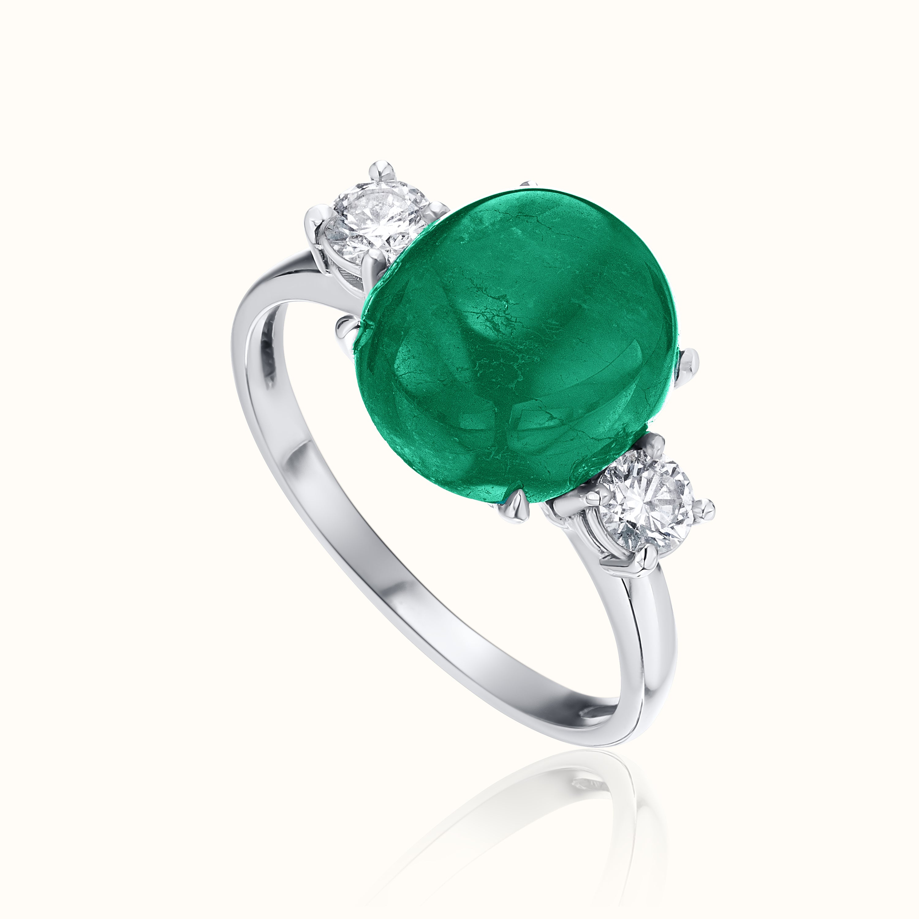 A bold statement ring featuring a rich cabochon emerald framed by natural diamonds, set in polished 14K white gold for a luxurious, heirloom feel.