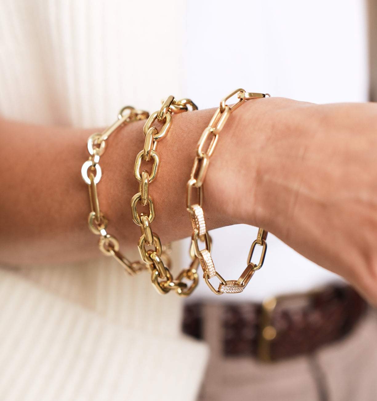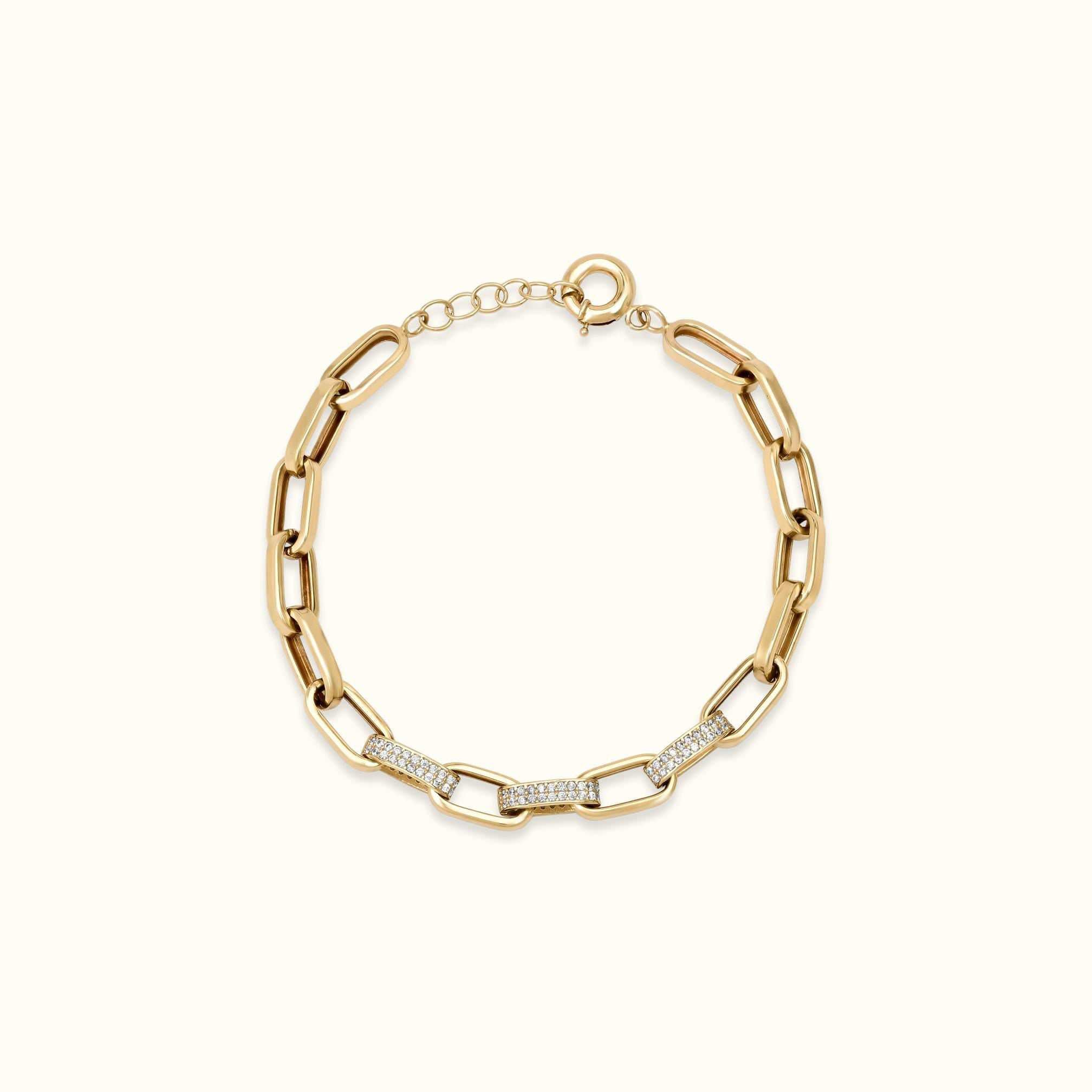 The Soleil Gold Link Bracelet takes flat oval hollow links and turns them into a classy utilitarian ornament for your arm, perfect for an everyday casual look. Three links, encrusted with sparkling cubic zirconias, accent this adjustable bracelet to give it touch of luxe and pavé shimmer.